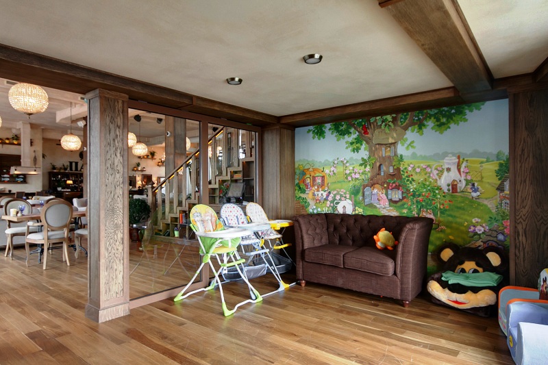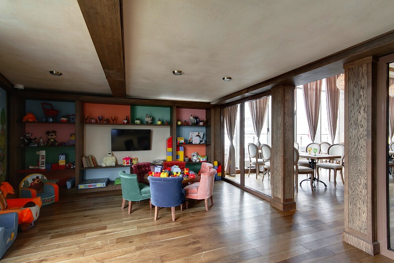 The family orientation of the restaurant is emphasized not only by nice interior, and warm cozy atmosphere, but also by large playroom for little guests.